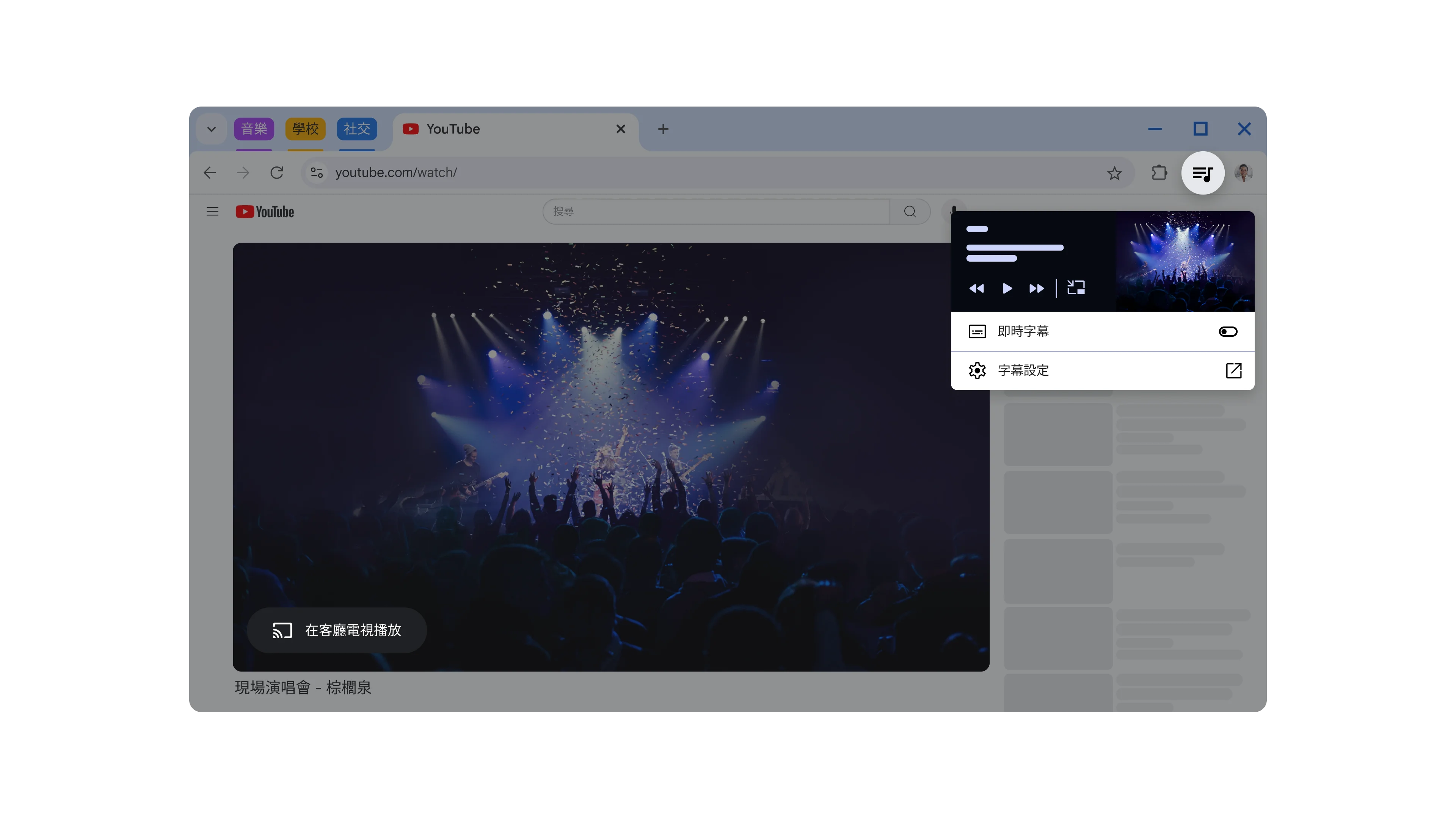 Chrome 讓你將電腦或手機的內容投放至內置 Google Cast 的電視。你可選擇投放整個螢幕,或只投放特定分頁。